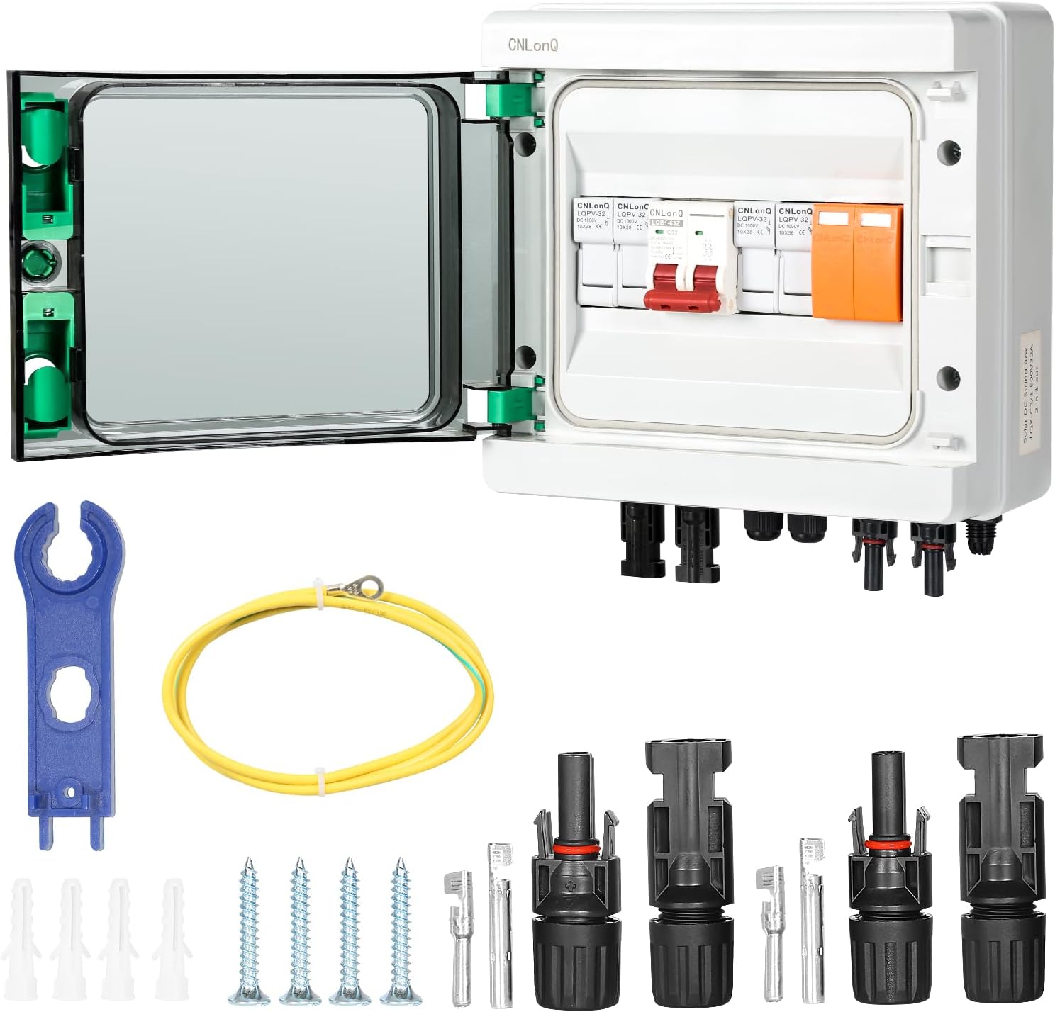 Solar PV Combiner Box,2 in 1 out 2 String Solar Distribution Combiner Box Connector for Solar Panel System,with 32A Photovoltaic DC Isolation Switch Circuit Breaker 40KA Arrester 15A Current Fuse