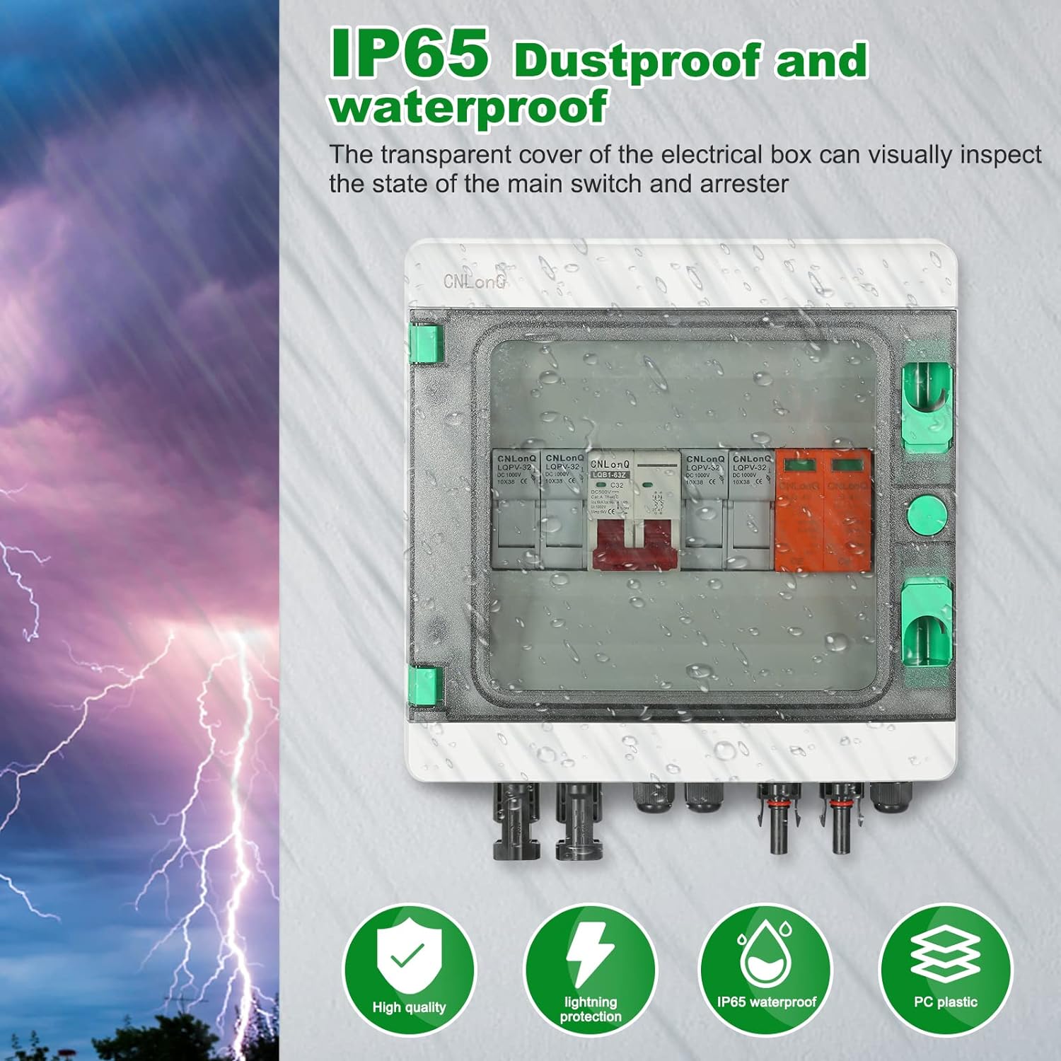 - Equipped with photovoltaic special high-voltage arrester, DC fuse box with 15A fuse and DC circuit breaker, providing multiple protections such as cutting off power supply isolation current, overload, lightning protection, etc.