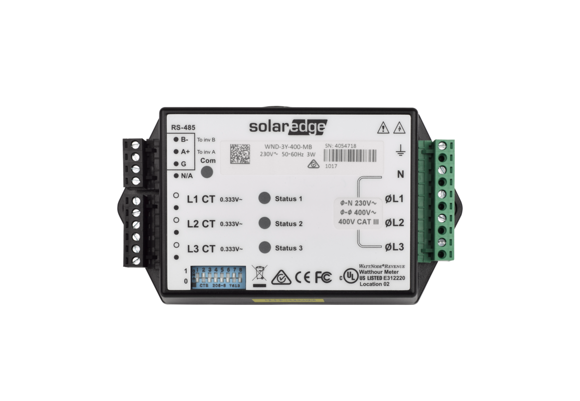 The SolarEdge Energy Meter with Modbus Connection measures production, consumption and feed-in to enable export control or limiting (supports G-100 in UK).
