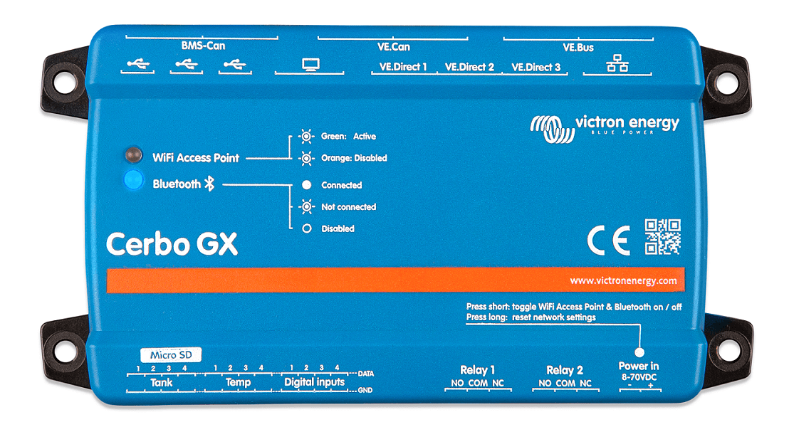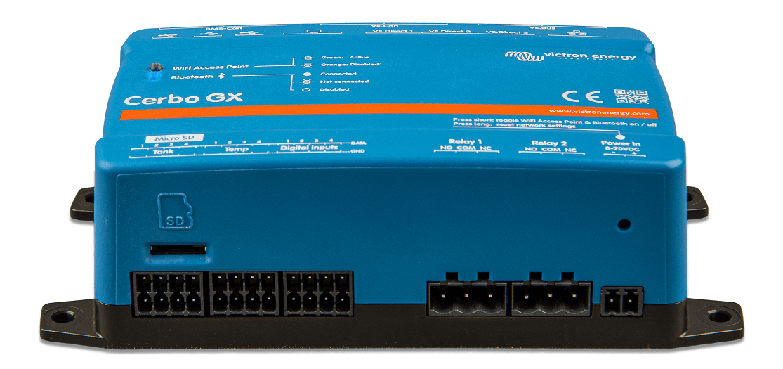 This all-new communication-centre allows you to always have perfect control over your system from wherever you are and maximises its performance. Simply connect through the Victron Remote Management (VRM) portal, or access directly, using the separate GX Touch 50, a MFD or VictronConnect app thanks to its added Bluetooth capability. This latest addition to the GX-range combines all the best of connectivity, redefining smart power solutions in every way.