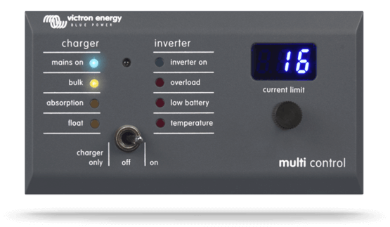 The Victron Digital Multi Control GX is remote control panel for Multiplus & Quattro inverter/chargers. It includes a rotary knob to set power control and power assist levels for two AC sources.